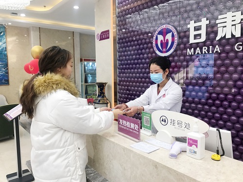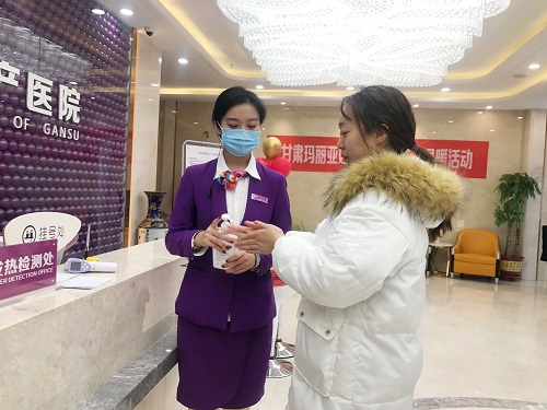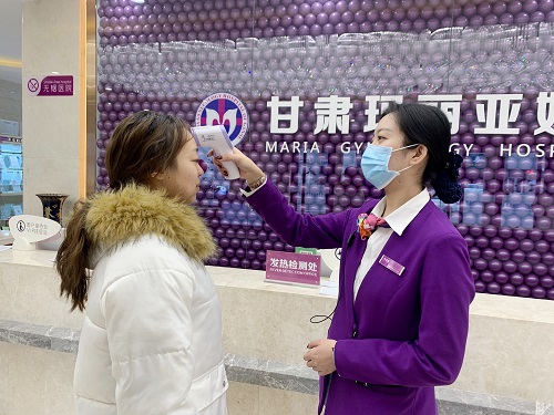 甘肃玛丽亚妇产医院严格执行:所有入院人员及探病家属均需进行体温测量,手消后方能进入,最大程度保持院内妇儿安全。