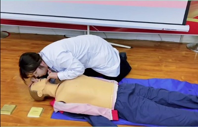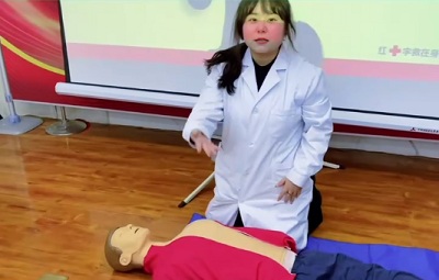 中国红十字总会训练中心的王蓉老师通过PPT从心搏骤停及生存链、心肺复苏、自动体外除颤器三大方面,就什么是心肺复苏、心肺复苏操作流程、心肺复苏效果评估、心肺复苏有效指征、心肺复苏终止条件多个内容进行了详细的讲解并现场进行规范动作示范。